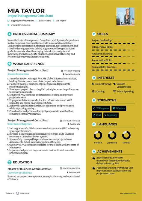 The professional experience section of a project management consultant's resume should highlight their work history as it relates to project management. This section should include job titles, employers, and job responsibilities. The consultant should focus on listing relevant work experience and avoid including irrelevant jobs. The descriptions should be clear and concise, highlighting the consultant's achievements and contributions to the success of the project.Project Management Achievements: Quantifying Successes and Results